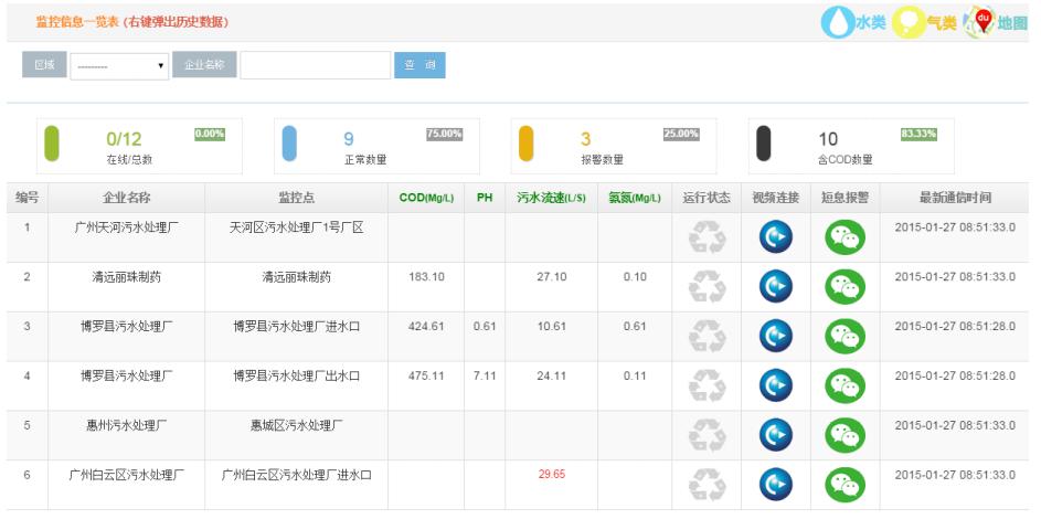 今天主要對監控數據的頁面進行詳細說明: 監控數據的主頁面包括在線監控的企業(或監測點)數量,正常排放的監控點數量,有異常報警處理的數量,還有包含監測指標的企業數量。并且顯示各個指標所占的百分比,利于數據分析。下面的表格頁面即顯示了詳細信息:企業的名稱監控點具體描述、監控指標名稱(如COD(mg/l)pH 流量氨氮等),運行狀態是否良好、可視頻鏈接、短信報警、最新通訊的時間幾大部分。每一個都可以詳細查看。如有異常或者超標的數據飄紅,直觀明了。