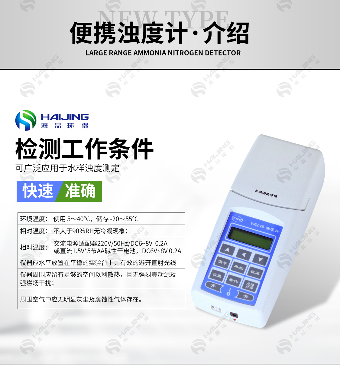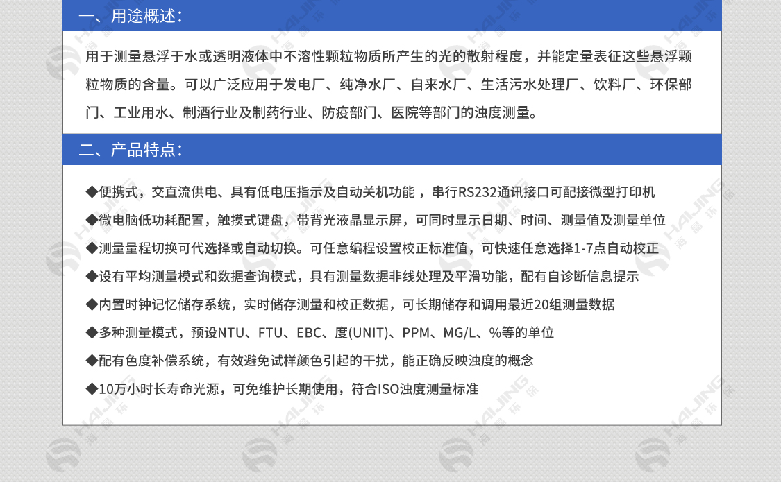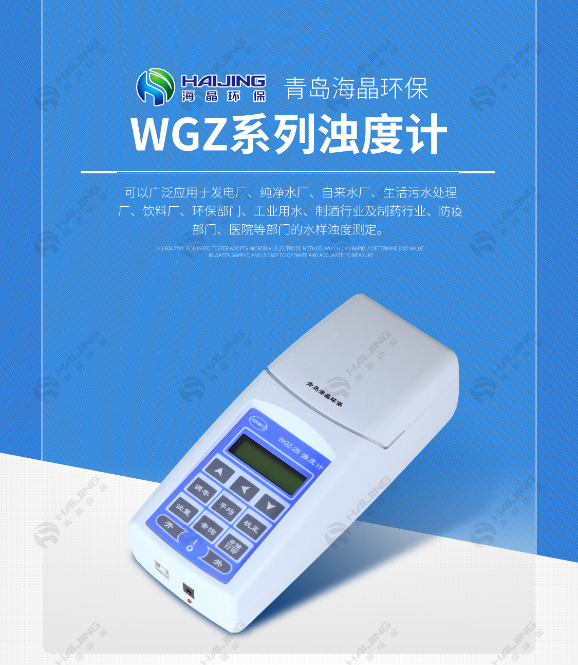 用于測量懸浮于水或透明液體中不溶性顆粒物質(zhì)所產(chǎn)生的光的散射程度,并能定量表征這些懸浮顆粒物質(zhì)的含量。可以廣泛應(yīng)用于發(fā)電廠、純凈水廠、自來水廠、生活污水處理廠、飲料廠、環(huán)保部門、工業(yè)用水、制酒行業(yè)及制藥行業(yè)、防疫部門、醫(yī)院等部門的濁度測量。