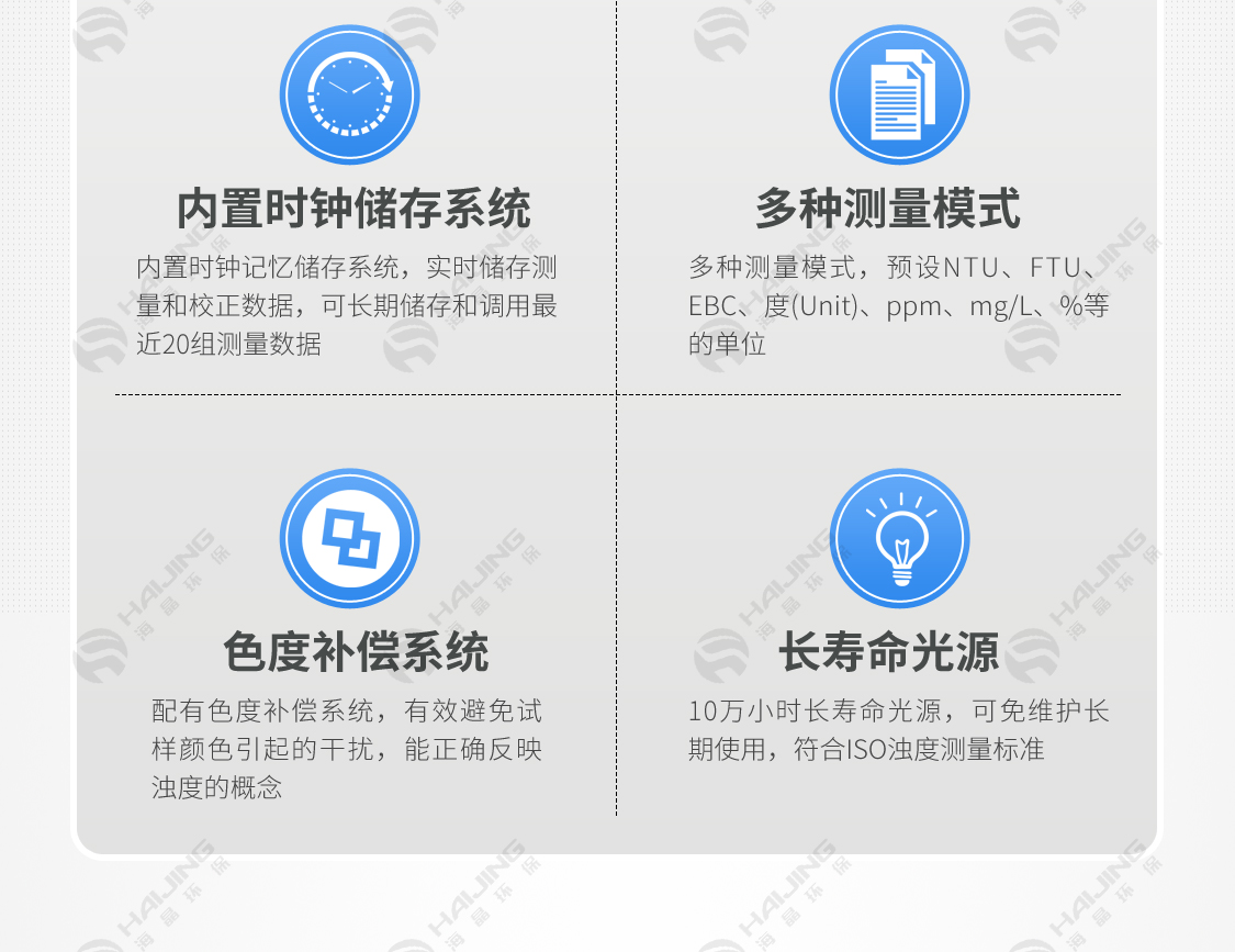 ◆多種測量模式,預(yù)設(shè)NTU、FTU、EBC、度(Unit)、ppm、mg/L、%等的單位