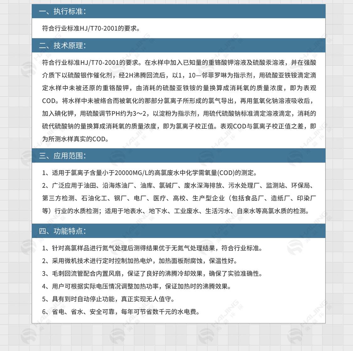 1、適用于氯離子含量小于20000mg/L的高氯廢水中化學(xué)需氧量(COD)的測定。