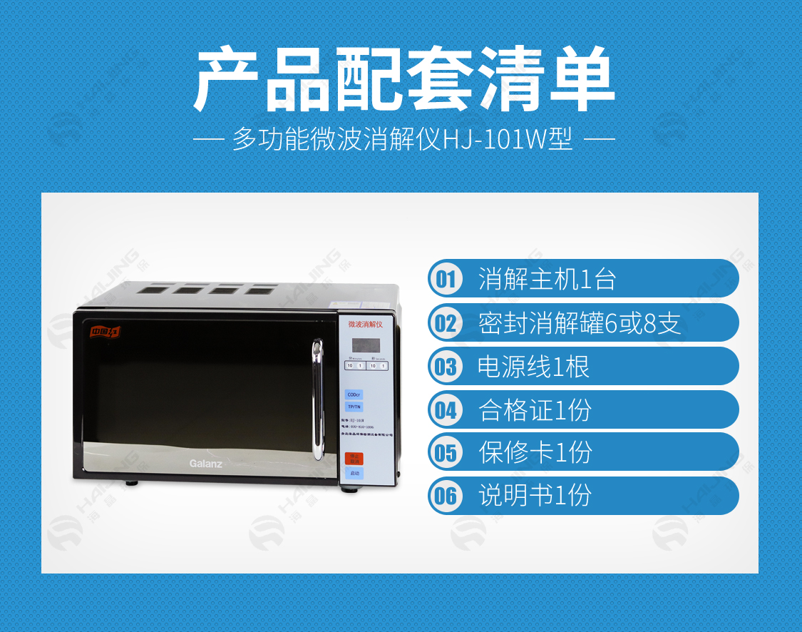 消解主機1臺,密封消解罐6支或8支,電源線1根,合格證、保修卡、說明書各一份。